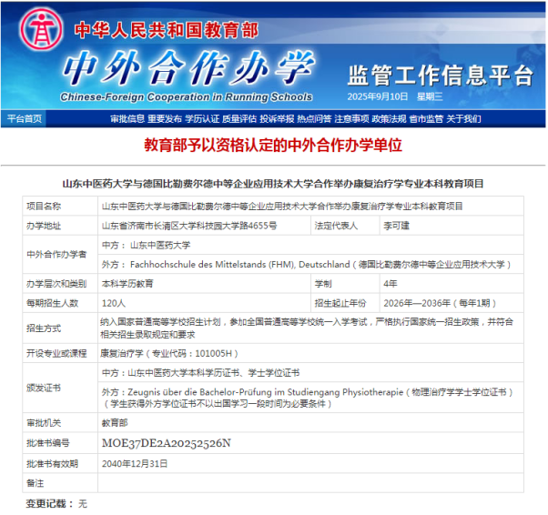 项目采用“4+0”联合办学模式,学生全程在我校完成学业,颁发双方学历学位证书,且学位获得者将直接具备德方物理治疗专业硕士入学资格,打通“本科-硕士”贯通式升学通道。为保障教学质量,学院将组建由中德双方资深教授、临床康复专家组成的国际化师资团队,开设德语强化课程与跨文化交流课程,培养具备国际视野、国际康复标准的高素质应用型人才。